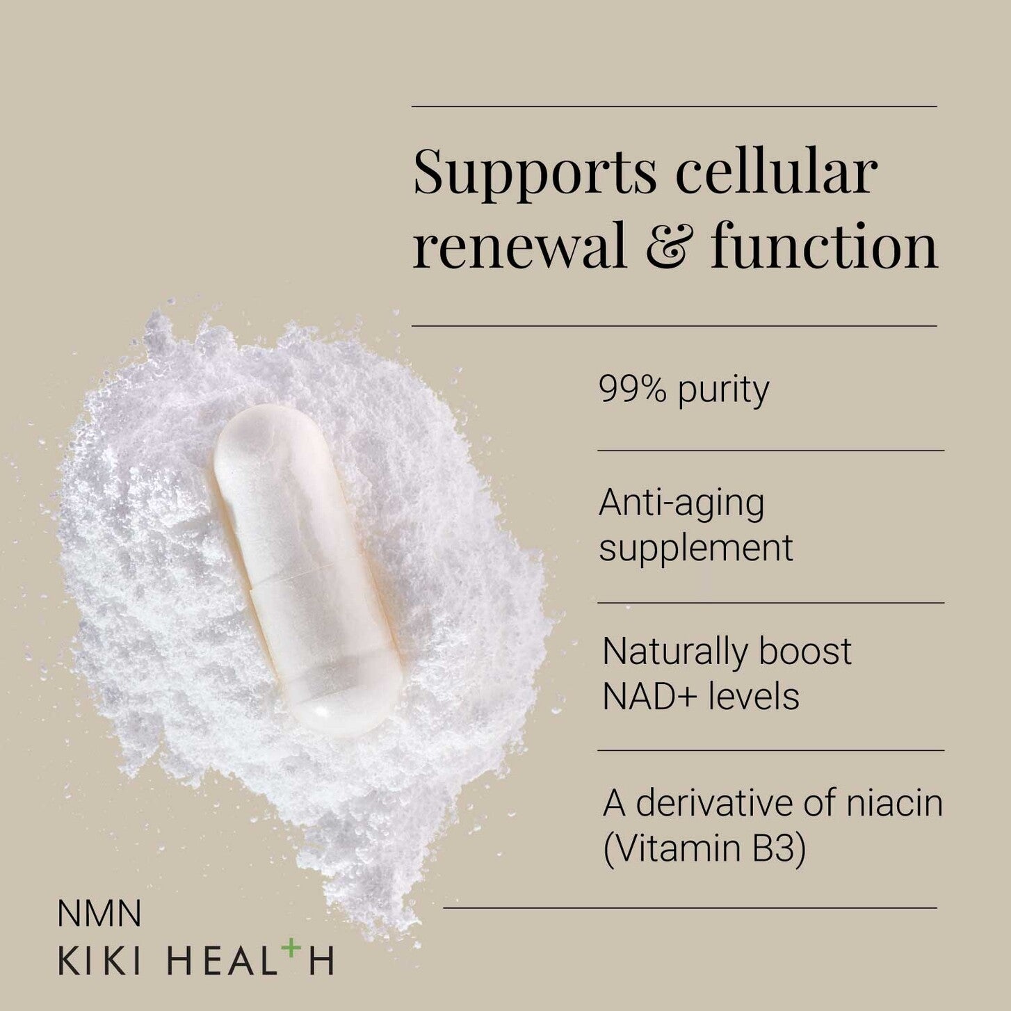KIKI Health's NMN formula ensures unrivaled absorption efficacy and a purity level of at least 99%, utilizing advanced enzymatic technology. With each capsule, unlock NMN's full potential for cellular rejuvenation and vitality.